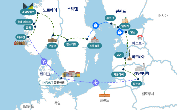 인천-기내(1)-코펜하겐(경유)-베르겐-보스(1)-플롬-송네피오르-포되(1)-게이랑에르-롬-릴레함메르(1)-오슬로-칼스타드(1)-스톡홀름-바이킹라인크루즈(1)-투르쿠-헬싱키-탈린(1)-리가(1)-샤울라이-빌뉴스(1)-(항공)-코펜하겐(1)-기내(1)-인천